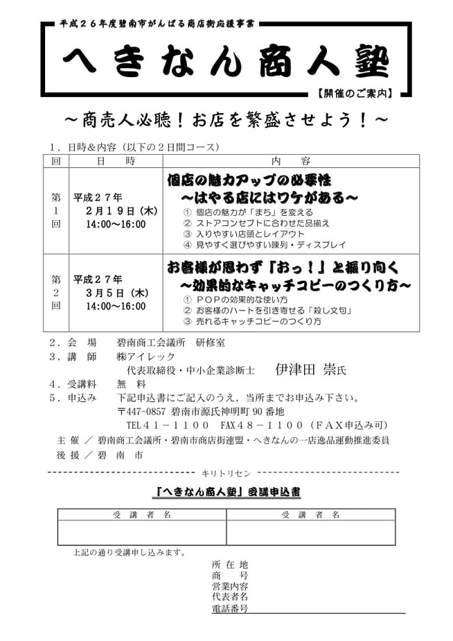 2/19(木)、3/5(木)の2回にわたって、愛知県碧南市の商業者を対象とした「へきなん商人塾」(碧南商工会議所主催)の講師をしました。